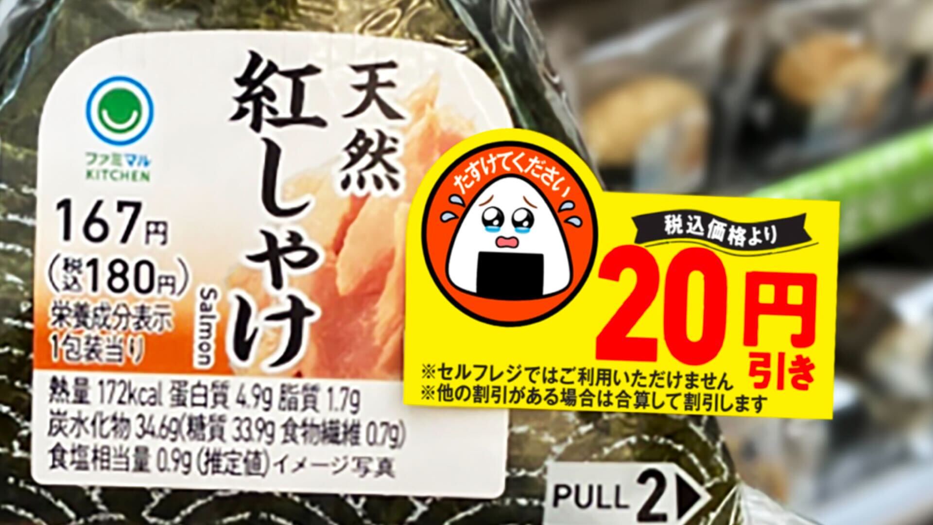 値引きシールに“たすけてください”と“涙目のおむすび”のイラストを追加し、感情に訴えかけるデザインに刷新。